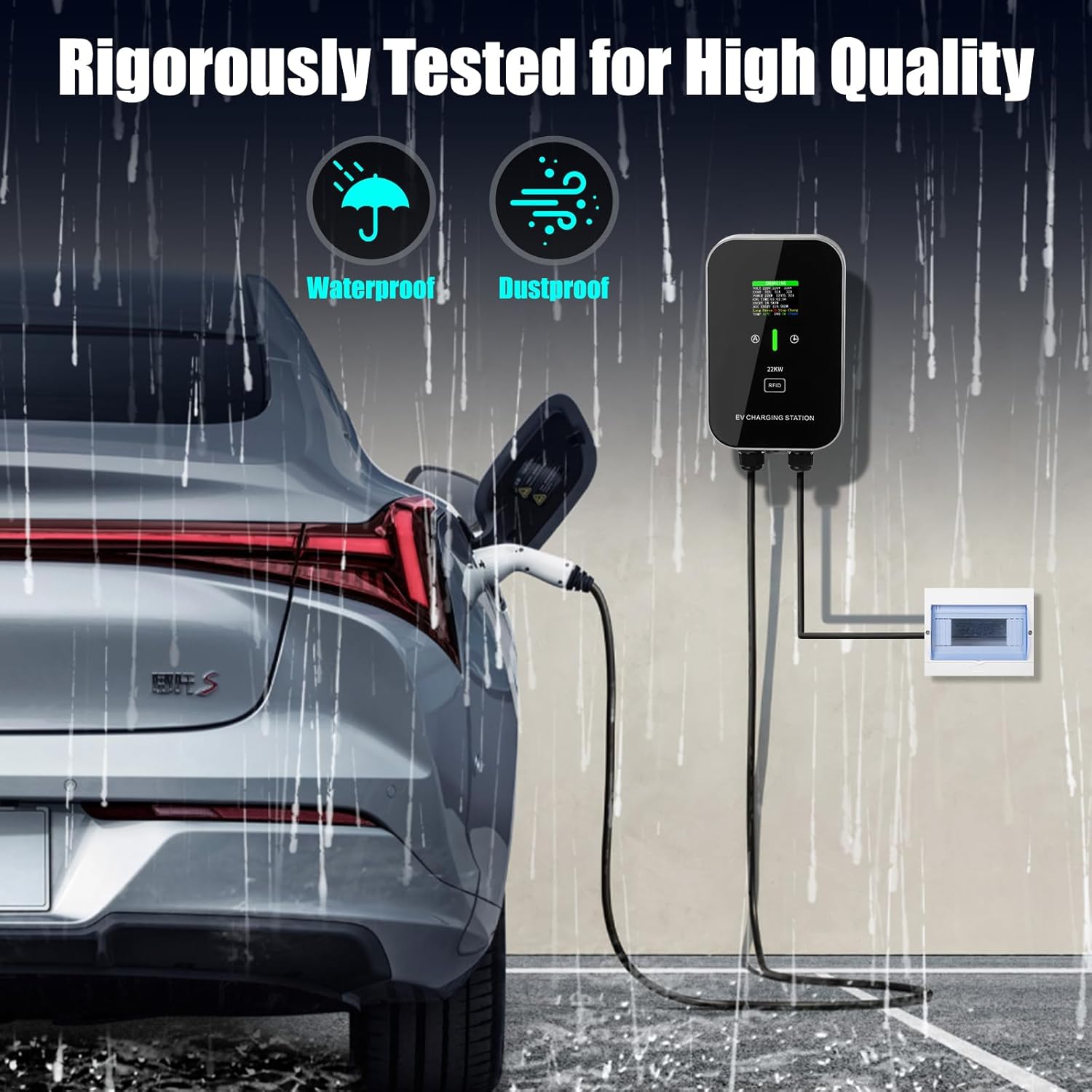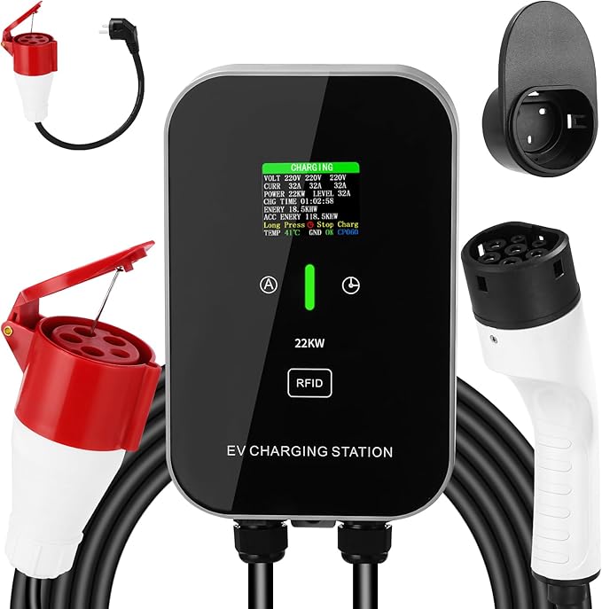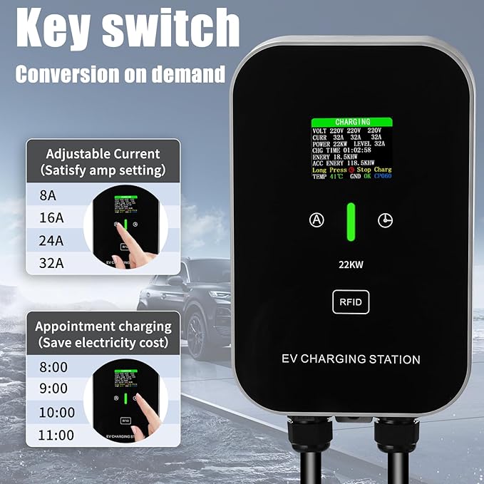Putere maximă de 22 kW (curent trifazat): încărcați complet mașina electrică în doar 3 ore. Curentul încărcătorului EV este reglabil la 8A / 16A / 24A / 32A, permițând încărcarea vehiculului cu intensitatea optimă.